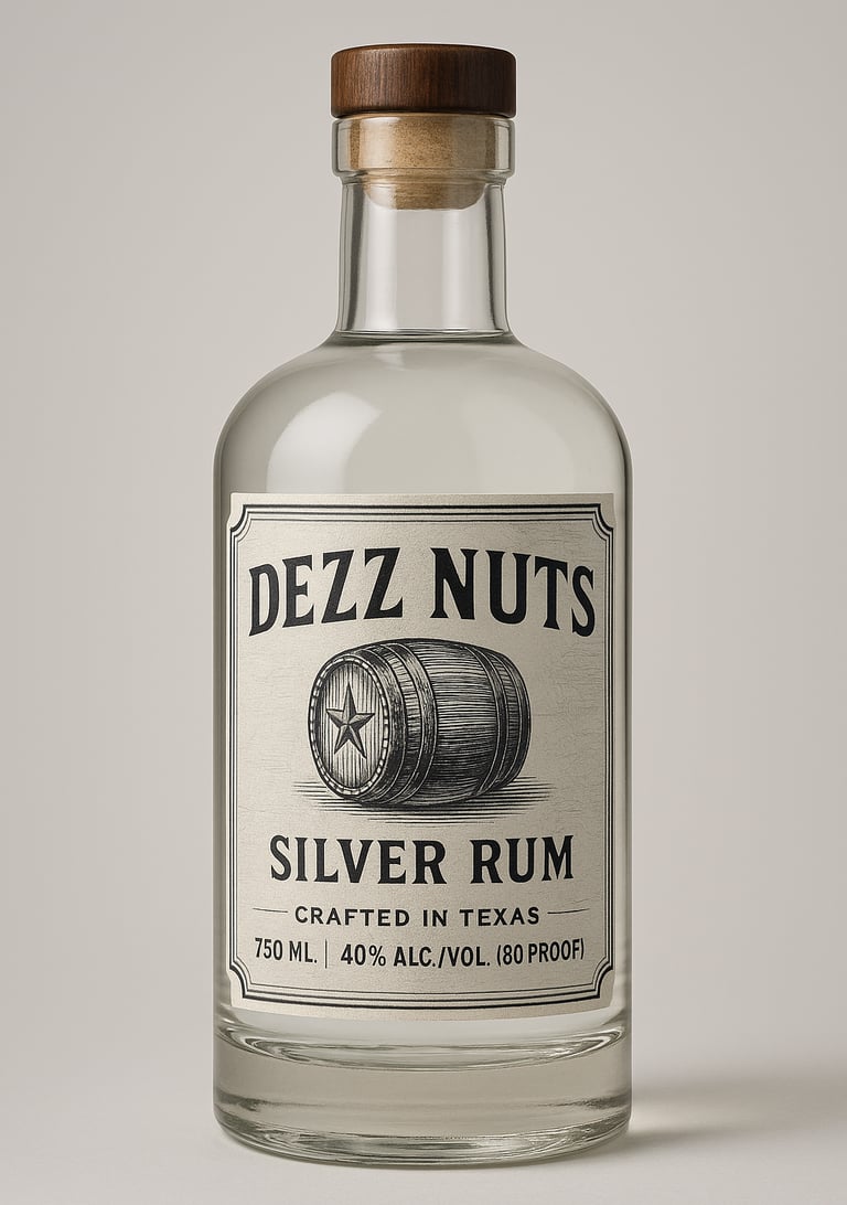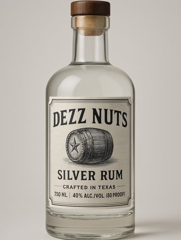 Distilled in the heart of Texas, Dezz Nuts Silver Rum is a bright, smooth spirit made from pure Gulf Coast molasses and pristine Hill Country water. Crystal clear and clean on the palate, it brings notes of sugarcane, citrus, and a hint of vanilla — perfect for mixing in your favorite cocktails or sipping with a twist.
